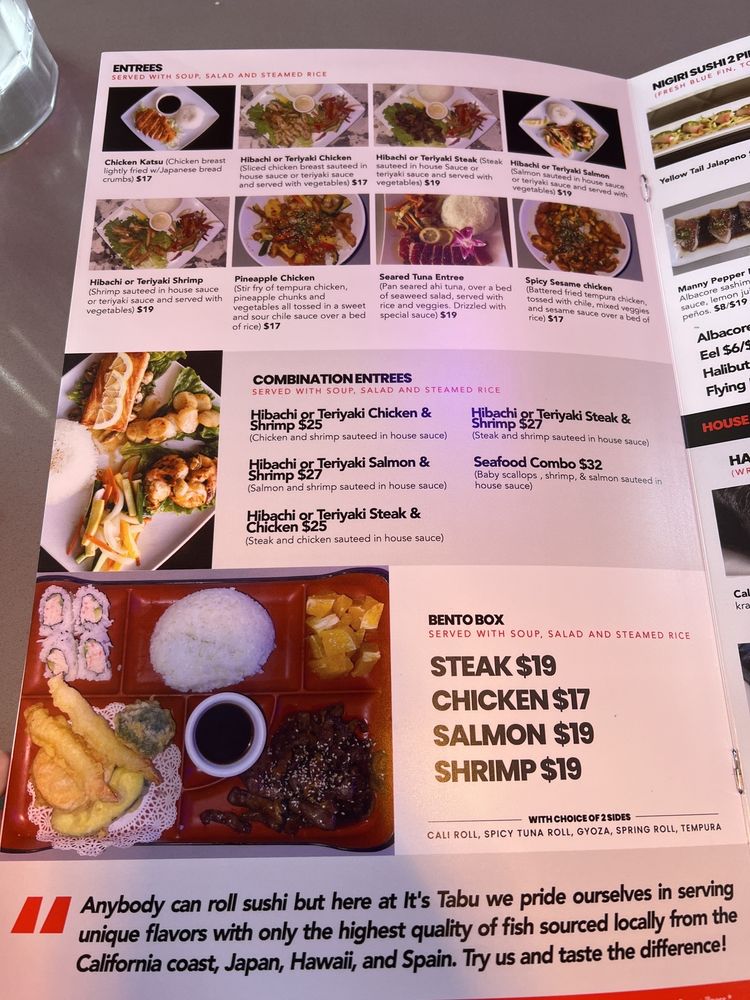 It's Tabu Sushi Bar & Grill, a family-owned gem established in 2005, has been delighting sushi enthusiasts with its innovative and traditional Japanese cuisine. Nestled in the heart of San Marcos, this vibrant eatery offers a unique dining experience that combines classic recipes with a modern twist. Known for its specialty rolls wrapped in soy paper and sans rice, It's Tabu Sushi invites diners to explore a menu filled with creative flavors and delightful surprises. The restaurant's journey began in Rancho San Diego, and with the dedication of the next generation of family owners, it has expanded to serve the North County communities. The modern decor and warm atmosphere make it a perfect spot for both casual dining and special occasions. Guests are welcomed by friendly staff who are eager to recommend their favorite dishes and ensure a memorable visit.
